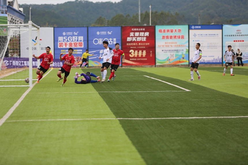 上半场比赛打响后,梧州市苍梧县六堡茶队迅速进入状态,凭借娴熟的团队配合持续向对方腹地施压,多次制造有威胁的进攻,直逼贵港市桂平市队球门。面对攻势,贵港市桂平市队防守端沉着冷静、稳扎稳打,守门员更是发挥神勇,屡次上演精彩扑救,将险情一一化解。第42分钟,梧州市苍梧县六堡茶队迎来攻势,9号球员冼浩杨主罚攻门,16号队友黄亚滨机敏补射,足球应声破网!“好球!”全场瞬间沸腾。上半场比赛结束,梧州市苍梧县六堡茶队以1:0领先贵港市桂平队!