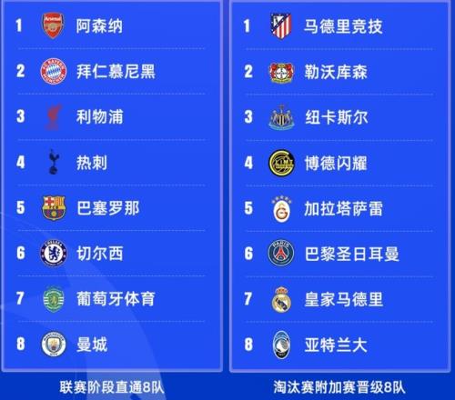 本届大赛包括了之前直通的8队,及附加赛晋级的8队,分别是阿森纳、拜仁、利物浦、热刺、巴塞罗那、切尔西、葡萄牙体育、曼城(直通,按名次排列),及皇马、巴黎、纽卡、马竞、亚特兰大、勒沃库森、加拉塔萨雷、博德闪耀(按小组赛的名词排列)。