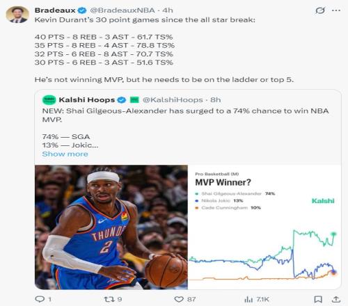 休媒Bradeaux写道:虽然杜兰特无法赢得MVP,但他至少应该进入MVP前五才对。