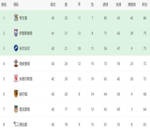 在考文垂确保升级之后,本赛季英冠还有2个升级名额,其中排名第二的伊普斯维奇,目前比米尔沃尔少赛1场,而且还领先2分,他们有机会锁定前二,直接升级。至于排名第三到第六的球队,则进行附加赛,决出最后一个升级名额,最终的结果如何,我们拭目以待!