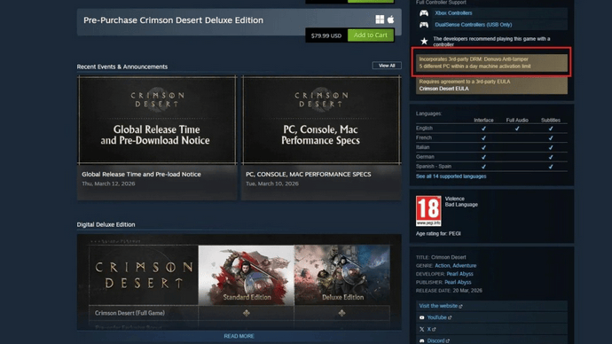 今年备受期待的开放世界游戏《红色沙漠》将于3月20日正式发售,但Pearl Abyss在发售前一周突然加入了D加密技术,这一举动引起了玩家广泛争议。