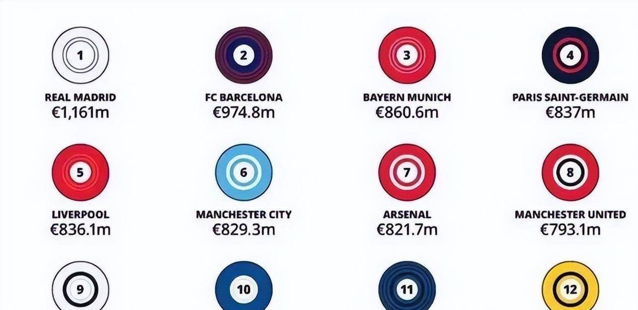 排名第六至第十位的俱乐部,则被英超球队包揽,分别是曼城、阿森纳、曼联、托特纳姆热刺和切尔西。英超联赛凭借天价的全球转播合同,为整个联赛奠定了雄厚的经济基础。在英超,即使成绩平平,也能通过分得巨额转播费而过上富足的生活。